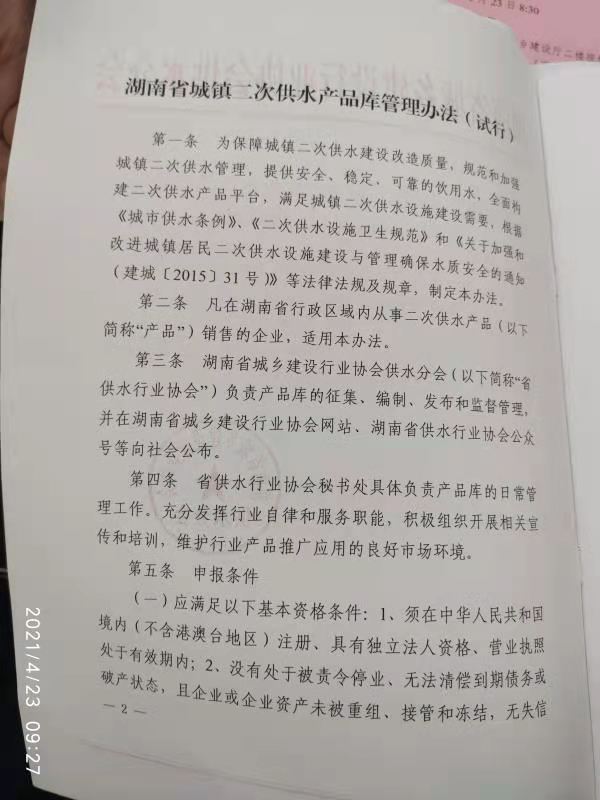 关于印发《湖南省城镇二次供水产品库管理 办法(试行)》的通知